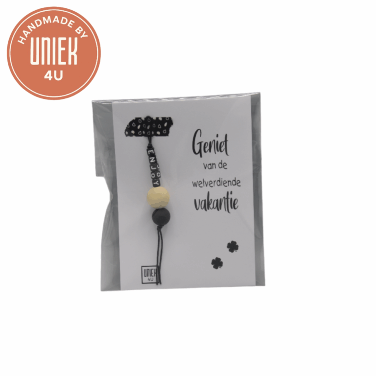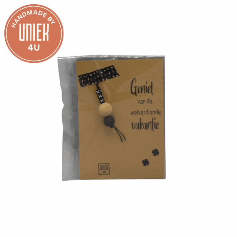 Uniek – sleutelhanger met kralen en kaartje in zakje – Geniet van de welverdiende vakantie