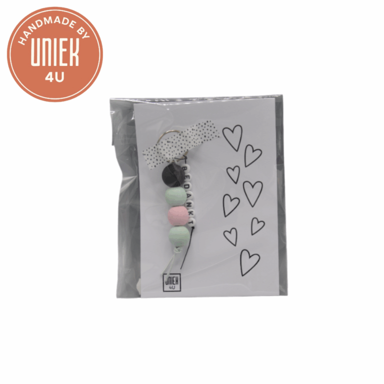 Uniek – sleutelhanger ‘Bedankt’ met kralen en kaartje met hartjes in zakje – diverse kleuren