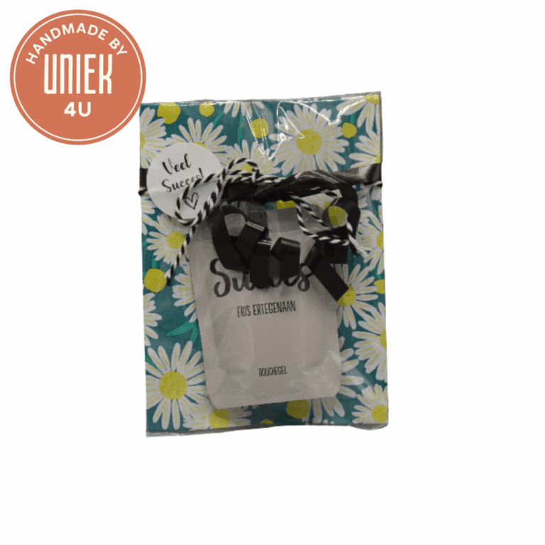 Uniek – douchegel met tekst in cadeauzakje – Succes, fris ertegenaan – beige