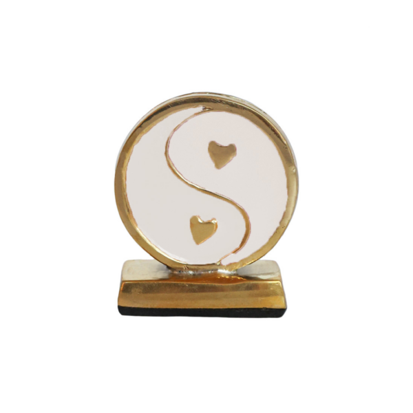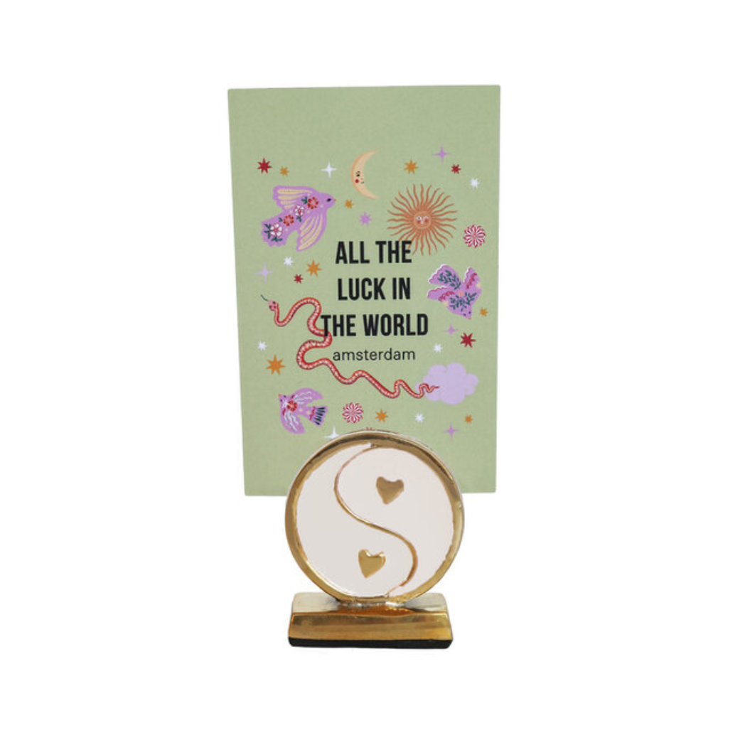 Stijlvolle kaartenhouder van All the Luck in the World in wit metaal, uitgevoerd in een speels Yin Yang-design. Ideaal voor het neerzetten van kaarten, foto’s of kleine notities op bureau, dressoir of nachtkastje.