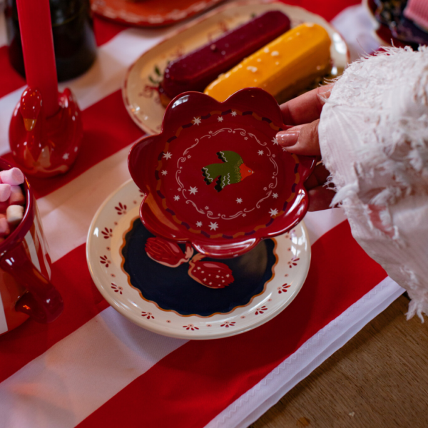 Het kleine bordje van All the Luck in the World is een keramieken merkproduct met een diameter van 12 cm. Het bordje is rood van kleur en voorzien van een groene vogel in het midden, wat een speels en vrolijk accent geeft. Ideaal als decoratief item of voor het serveren van kleine lekkernijen.
