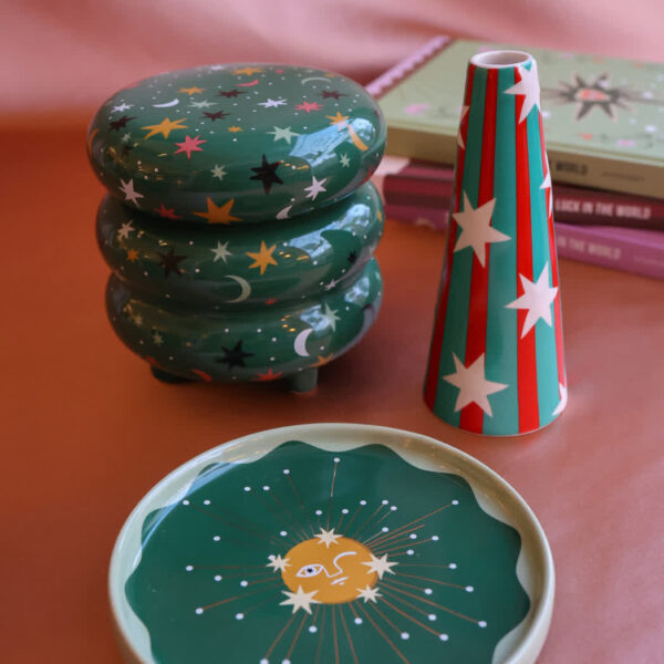 De kleine vaas van All the Luck in the World is een rond keramieken merkproduct met een speels ontwerp van groene en rode strepen en witte sterren. Perfect om je interieur op te fleuren met een vleugje kleur en stijl.