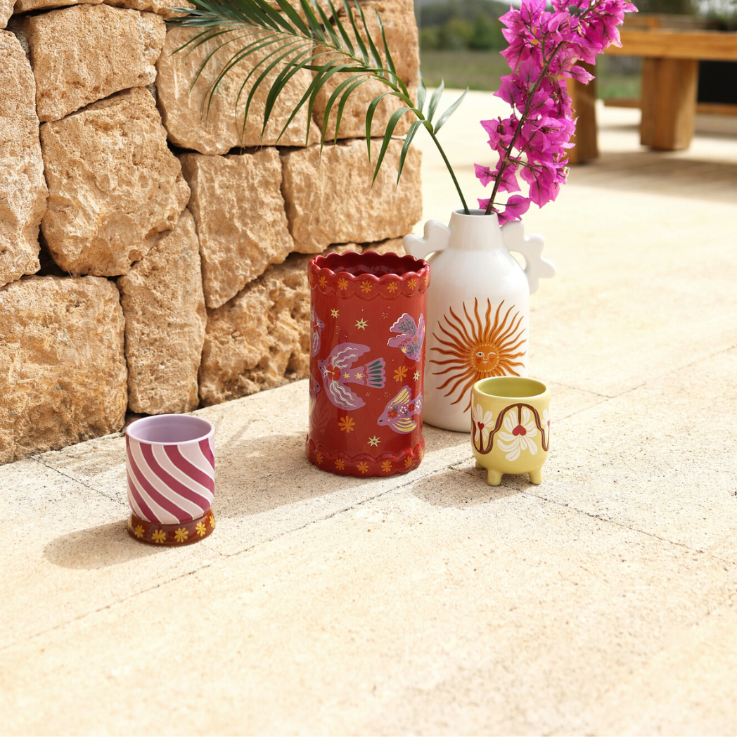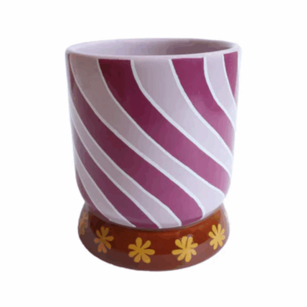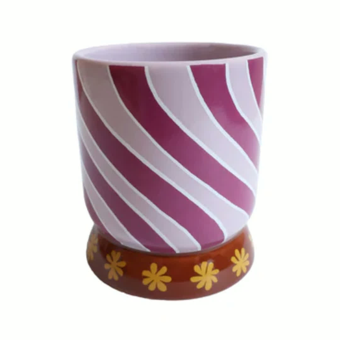 Dit gestreepte bloempotje van All the Luck in the World combineert donkerpaarse en lichtpaarse tinten in een rond keramieken ontwerp. Met een diameter van 7,5 cm en een hoogte van 9 cm is het een compact en stijlvol merkproduct dat perfect past in verschillende interieurs. Dankzij het multifunctionele design kun je het niet alleen als bloempot gebruiken, maar ook als mok voor bijvoorbeeld koffie, wat het extra praktisch maakt.