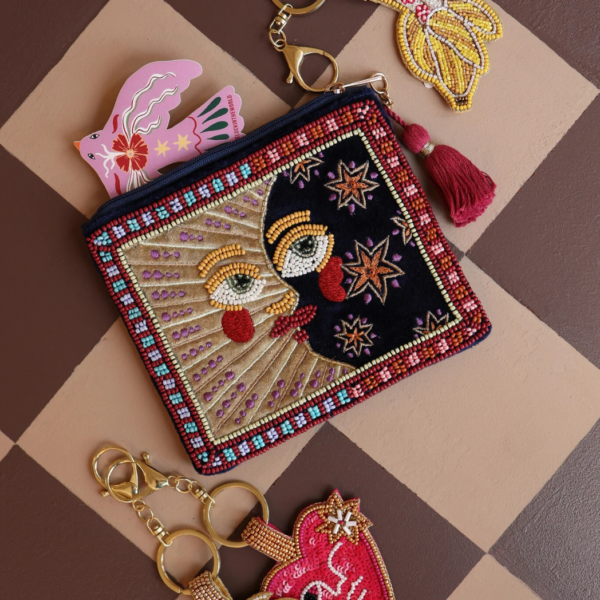 De All the luck in the world portefeuille is perfect om je geld, make-up of andere kleine spullen netjes bij elkaar te houden. Gemaakt van zacht fluweel en versierd met fijne kraaltjes, heeft deze portefeuille een unieke uitstraling. De kleuren beige, blauw en rode tinten geven het een warme en stijlvolle look. Handig voor in je tas én leuk om te zien!