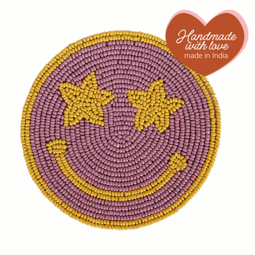 De All the luck in the world onderzetter met smiley is een ronde onderzetter in lila en geel, gemaakt van katoen en kralen. Met een afmeting van 10 x 10 cm heeft deze onderzetter een compact formaat dat geschikt is voor glazen en kopjes. De smiley van kralen geeft de onderzetter een speelse en decoratieve uitstraling. Het katoenen materiaal in combinatie met de kralen zorgt voor een unieke en opvallende afwerking op tafel.