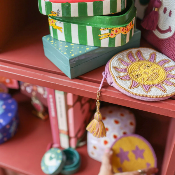 Gemaakt van kralen en stof, met een vrolijk wit-paars-gele zonprint. De portemonnee is rond van vorm en ongeveer 10 cm lang. Ideaal voor kleingeld, kleine essentials of als decoratieve accessoire in je tas.