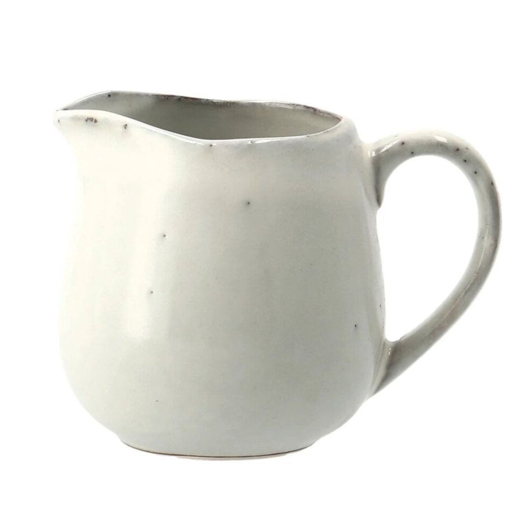 Melkkan van Broste Copenhagen in een stijlvolle grijze kleur. Gemaakt van keramiek en rond van vorm, met een diameter van 12 cm inclusief oortje (8 cm zonder) en een hoogte van 9 cm. Een praktisch en decoratief merkproduct, ideaal voor het serveren van melk, koffie of andere dranken.