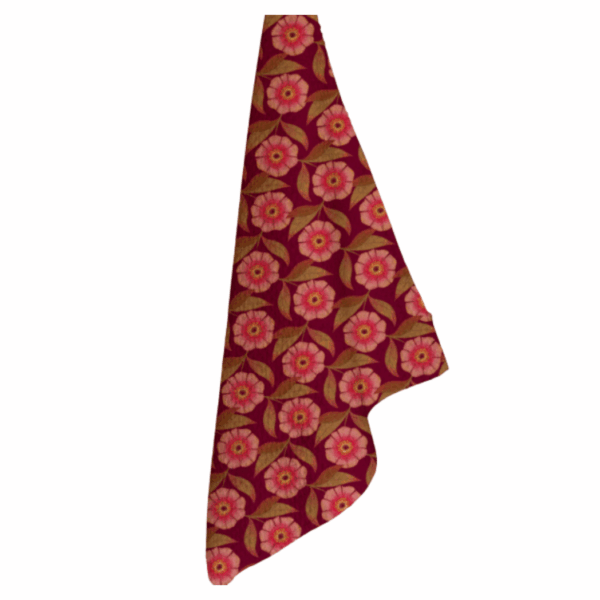 De keukendoek Autumn Bloom van Bubble & Blend is gemaakt van gerecyclede materialen en uitgevoerd in paars/roze met tinten geel en bruin, met een print van roze bloemen en geelbruine bladeren op een paarse achtergrond. De rechthoekige doek heeft een afmeting van 70 x 50 cm en is een duurzaam merkproduct. Dankzij het stijlvolle ontwerp brengt deze keukendoek zowel functionaliteit als een kleurrijke touch in je keuken.