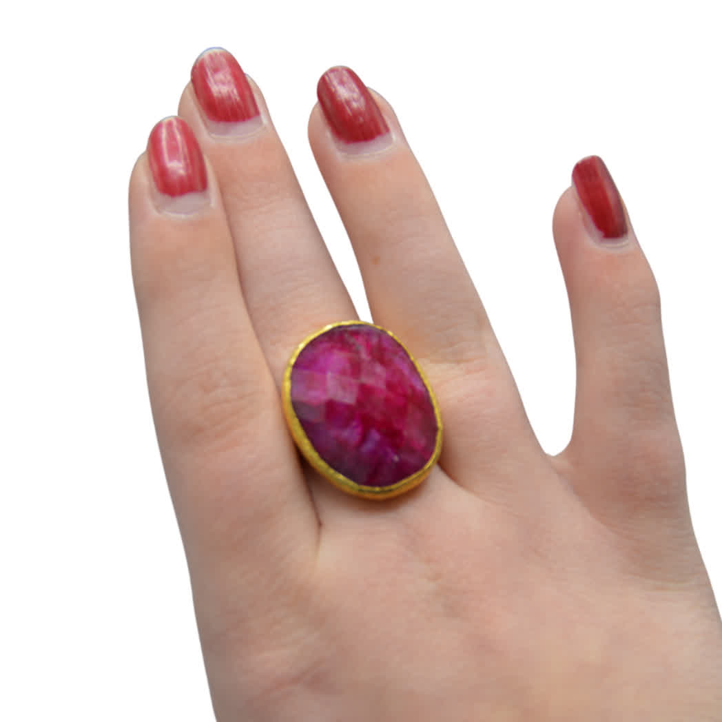 De By Jam Gioielli ring met roze edelsteen is een stijlvol en vrouwelijk sieraad. De goudkleurige band laat de zachte, roze tint extra stralen. Omdat het een natuursteen is, kan de kleur iets afwijken van de foto, wat elke ring uniek maakt. Perfect om je outfit een elegante en luxueuze touch te geven.