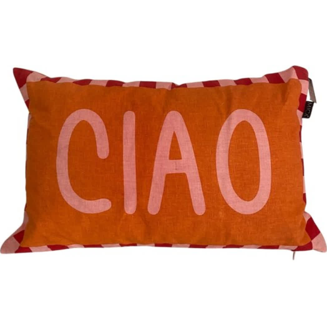 Dit vrolijke Ciao kussen van Mica brengt direct kleur en sfeer in je interieur. De combinatie van oranje, rood en roze zorgt voor een speelse en zomerse uitstraling. De kussen is perfect voor op de bank, stoel of bed en een echte eyecatcher in elke ruimte.