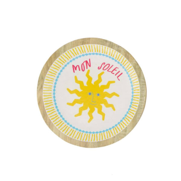 Dit ronde bord “Mon soleil” van Dijk Natural Collections is een decoratief bord, gemaakt van polyhars met een afmeting van 14,5 x 14,5 x 1,3 cm. Dit merkproduct is uitgevoerd in de kleuren wit en geel en is voorzien van de tekst “Mon soleil” met een afbeelding van een zon. De ronde vorm en het compacte formaat maken het geschikt als decoratief item. Een vrolijk bord met een frisse en zonnige uitstraling.