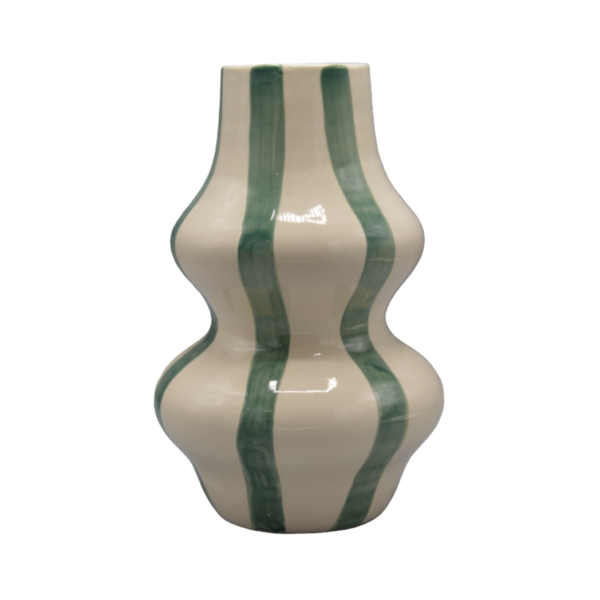 Deze prachtige bubbelvormige vaas van DIJK is een echte blikvanger in huis. De vaas heeft een stijlvolle witte basis met subtiele groene strepen, wat zorgt voor een speels maar toch elegant effect. Met een hoogte van 30 cm is het een statement piece dat zowel zonder als met bloemen prachtig tot zijn recht komt. Perfect voor op een dressoir, tafel of in een open kast om je interieur direct meer karakter te geven.