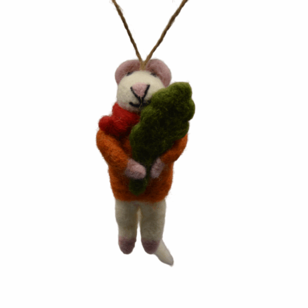 Deze schattige vilten kersthanger in de vorm van een muis met blaadje brengt een speels accent in je kerstboom. Handgemaakt met oog voor detail en 13 cm hoog – perfect voor een warme, feestelijke sfeer.