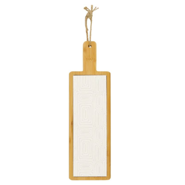 De Dijk serveerplank met keramieken print is een rechthoekige serveerplank met een afmeting van 12 x 1,2 x 42 cm. Dit merkproduct is uitgevoerd in de kleuren beige en wit en gemaakt van een combinatie van bamboe en keramiek. De keramieken print geeft de plank een stijlvolle uitstraling, terwijl het bamboe zorgt voor een natuurlijke basis. Een decoratieve en praktische serveerplank voor het presenteren van hapjes.