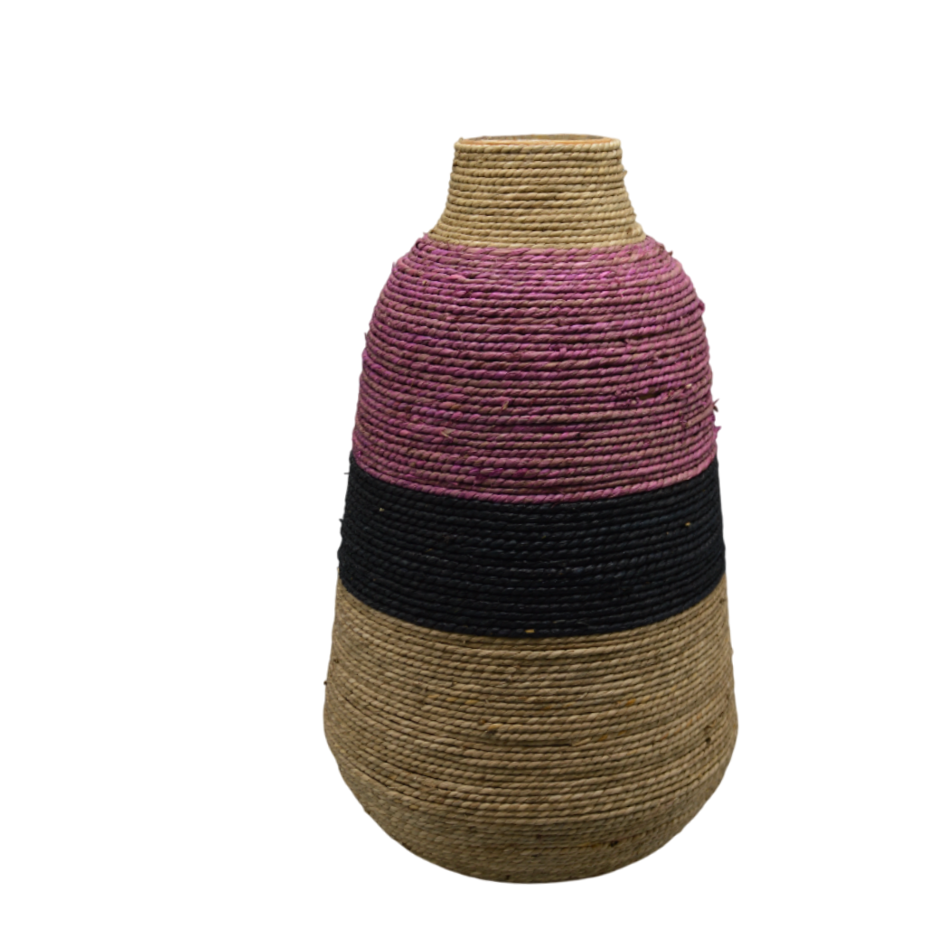 Decoratieve vaas van Dijk met een stijlvolle mix van naturel, paars en zwart. De vaas is gemaakt van bamboe en zeegras, wat zorgt voor een natuurlijke, duurzame uitstraling en een uniek textuureffect. Met een ronde vorm en een formaat van 42 × 25 cm is deze vaas ideaal als blikvanger op een dressoir, tafel of vensterbank, zowel met bloemen als als decoratief object zonder inhoud. Een perfect accessoire voor een boho, modern of natuurlijk interieur.