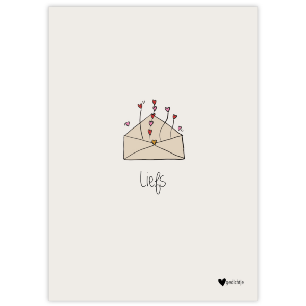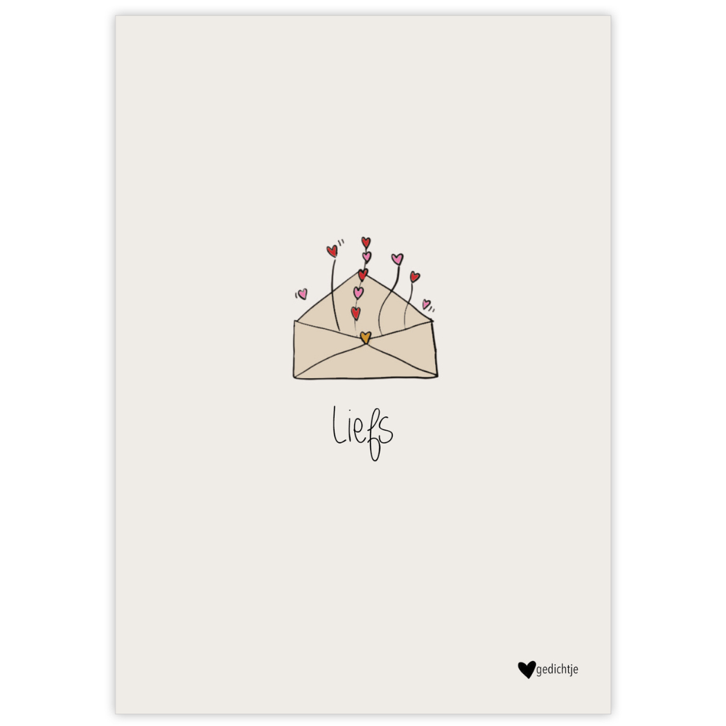 De Give-X wenskaart “Liefs” is een rechthoekige A6-kaart van 10,5 x 14,8 cm, gemaakt van papier. De kaart is wit en voorzien van een illustratie van een lichtbruine envelop met kleine rode en roze hartjes, met de tekst “Liefs” op de voorkant. Dit merkproduct wordt geleverd met envelop en is ideaal om een persoonlijke boodschap mee te geven. Een stijlvolle en liefdevolle wenskaart voor elk moment.