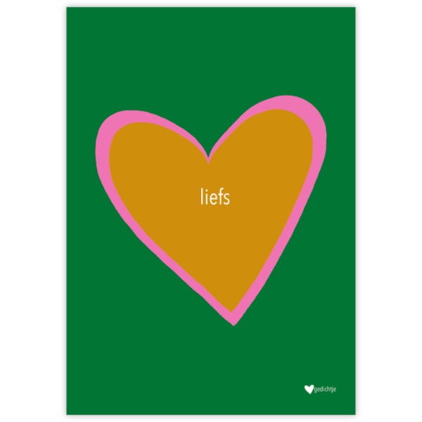 De Give-X wenskaart “Liefs” is een rechthoekige kaart van papier in A6-formaat van 10,5 x 14,8 cm. De kaart is uitgevoerd in groen en heeft een illustratie van een donkergeel hart met een roze rand. Dit merkproduct bevat de tekst “Liefs” en heeft een compacte, handzame afmeting. Een stijlvolle wenskaart om een lieve boodschap over te brengen.