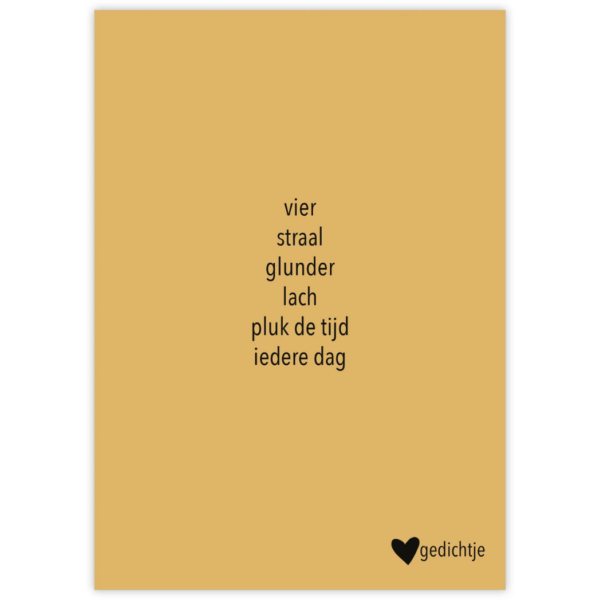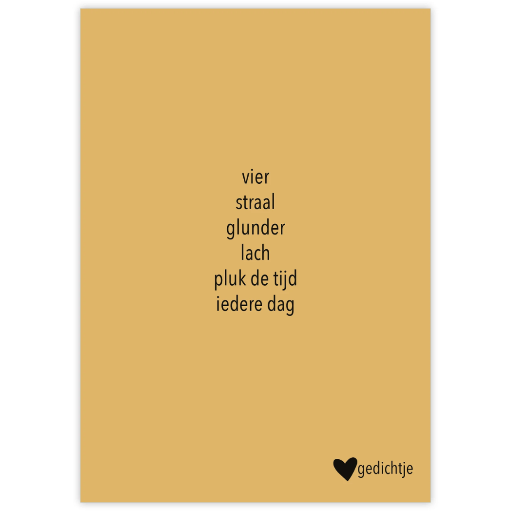 De Give-X wenskaart “Vier straal glunder” is een rechthoekige kaart van papier in de kleur donkergeel, uitgevoerd in A6-formaat van 10,5 x 14,8 cm (105 x 148 mm). Deze merkproduct wenskaart bevat de tekst “Vier straal glunder lach pluk de tijd iedere dag”. Het compacte formaat maakt de kaart geschikt om te versturen of toe te voegen aan een cadeau. Een vrolijke kaart met een positieve boodschap voor elk moment.