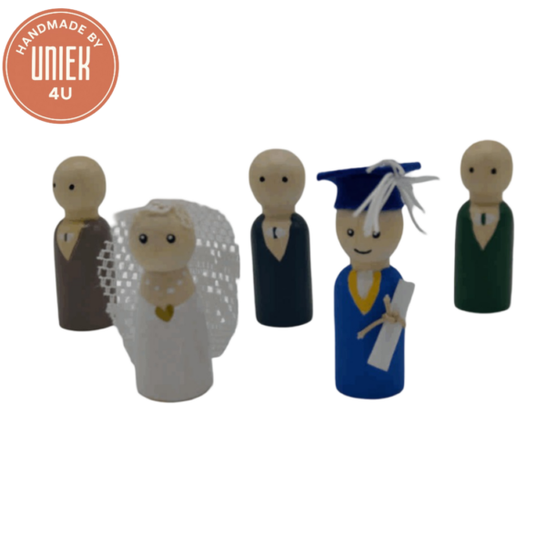 Deze handgemaakte poppetjes in grijs, blauw, groen en wit zijn perfect als symbolisch cadeautje voor een bruiloft, gezin of geslaagde. Ze stralen eenvoud en warmte uit en passen mooi bij elk moment van viering. Leuk om neer te zetten als decoratie of om cadeau te geven als blijvende herinnering. Een persoonlijk en stijlvol detail voor bijzondere gelegenheden.
