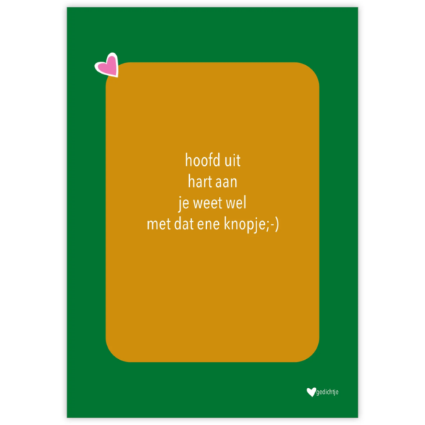 Hartgedichtje – wenskaart met envelop – Hoofd uit hart aan, je weet wel, met dat ene knopje;-) – groen/bruin