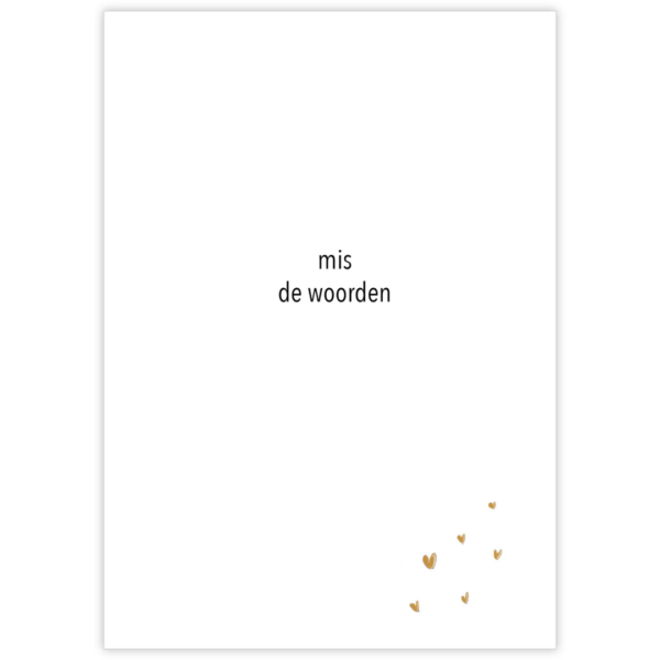 Deze Hartgedichtje wenskaart is een rechthoekige A6-kaart, gemaakt van papier en uitgevoerd in de kleur crème. Op de kaart staat de tekst “Mis de woorden”. Dit merkproduct wordt geleverd met envelop en heeft een rustige en ingetogen uitstraling. Een persoonlijke wenskaart om gevoelens op een subtiele manier te delen.