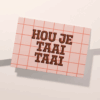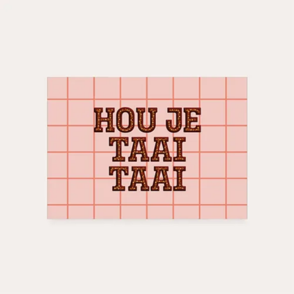 Rechthoekige wenskaart van papier in roze met rode accenten, met de tekst “Hou je taai taai” in bruin. Afmeting: 15 x 10,5 cm, perfect om iemand op te vrolijken. Bestel nu deze leuke kaart!