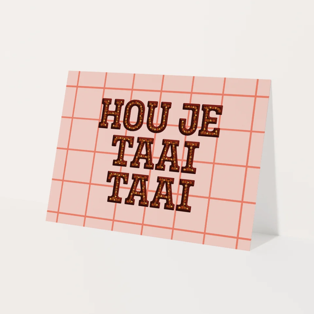Rechthoekige wenskaart van papier in roze met rode accenten, met de tekst “Hou je taai taai” in bruin. Afmeting: 15 x 10,5 cm, perfect om iemand op te vrolijken. Bestel nu deze leuke kaart!