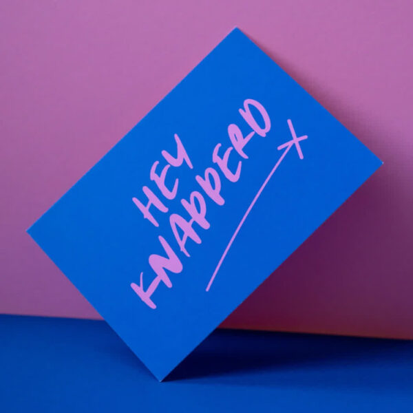 Verras iemand met een glimlach dankzij deze vrolijke Wenskaart van Heyday. Op de Blauwe achtergrond staat de speelse tekst “Hey knapperd” in Roze letters. De kaart is rechthoekig, en gemaakt van stevig papier. Perfect voor een compliment, flirt of gewoon zomaar. Een luchtig en lief kaartje dat opvalt!