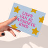 Liefdevol en speels: deze Heyday A6 kaart in lichtblauw is perfect om een warme boodschap te sturen. De tekst “Liefs van je favoriete kind” staat in vrolijk roze, aangevuld met oranje sterren voor een extra vrolijke touch. Gemaakt van stevig papier in rechthoekig formaat 15 x 10,5 cm. Ideaal om iemand te laten weten hoeveel je om hen geeft.