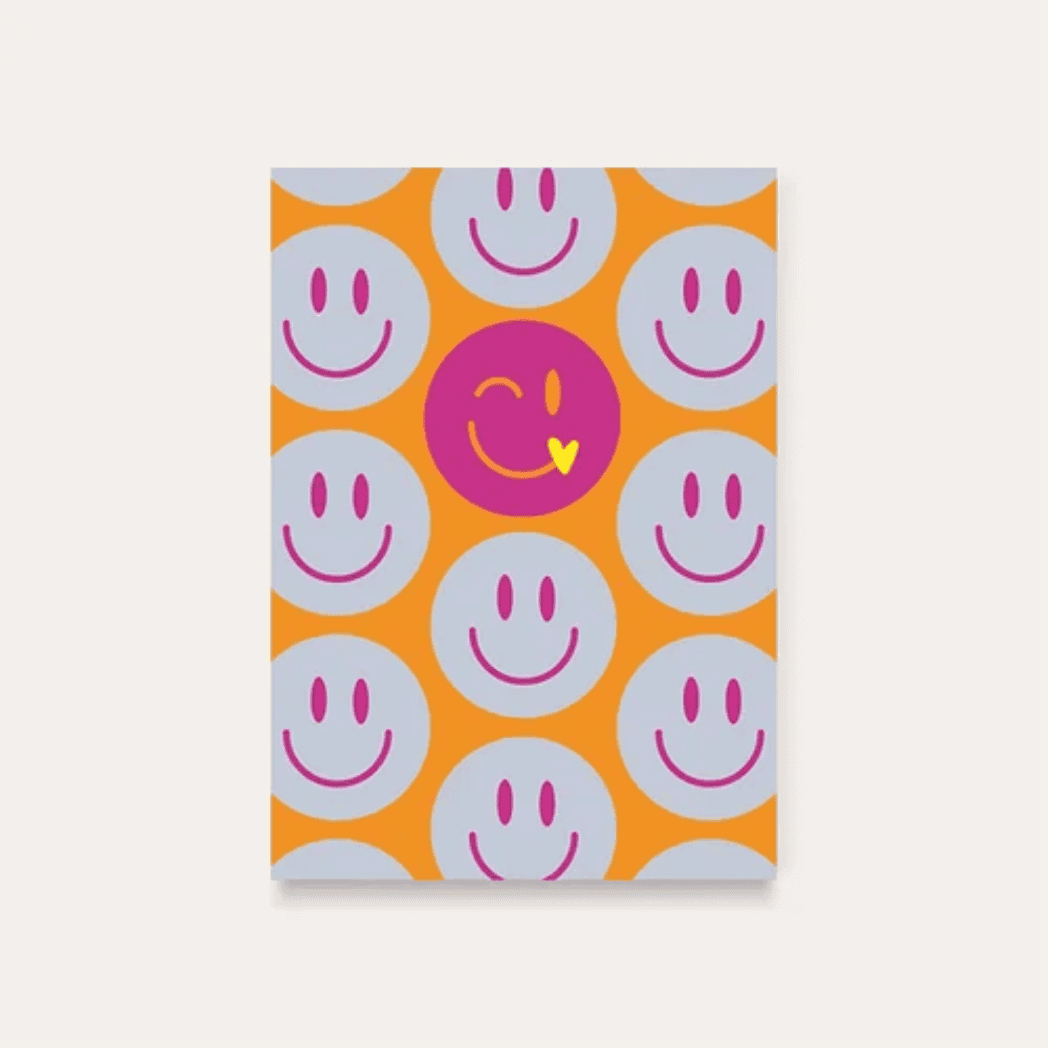 Vrolijk en speels: deze Heyday A6 kaart in oranje brengt direct een glimlach. Versierd met leuke smileys in grijs en paars voor een frisse en moderne uitstraling. Gemaakt van stevig papier in rechthoekig formaat 15 x 10,5 cm. Perfect om iemand blij te verrassen. Leuk om te versturen of bij een cadeautje te doen.