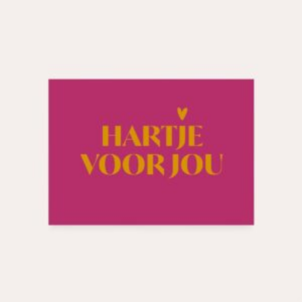 Verras iemand met dit lieve A6-kaartje van Heyday. Op de paarse achtergrond staat de zonnige gele tekst “Hartje voor jou” – simpel en hartverwarmend. Het kaartje is rechthoekig, 15 x 10,5 cm en gemaakt van stevig papier. Perfect voor een klein gebaar vol liefde. Een vrolijk kaartje dat altijd goed doet!