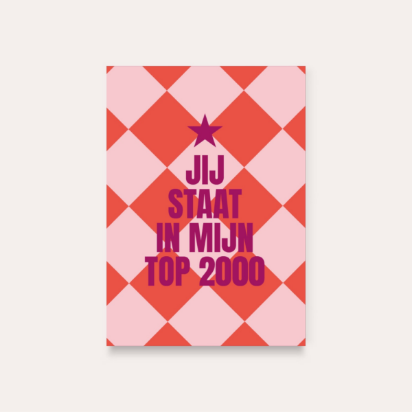 Feestelijke Heyday Wenskaart met de tekst “Jij staat in mijn top 2000”, uitgevoerd in Rood en Roze papier. Het rechthoekige maakt deze kaart ideaal om een warme kerstgroet te sturen. Perfect voor muziekliefhebbers en iedereen die je een glimlach wilt bezorgen tijdens de feestdagen.