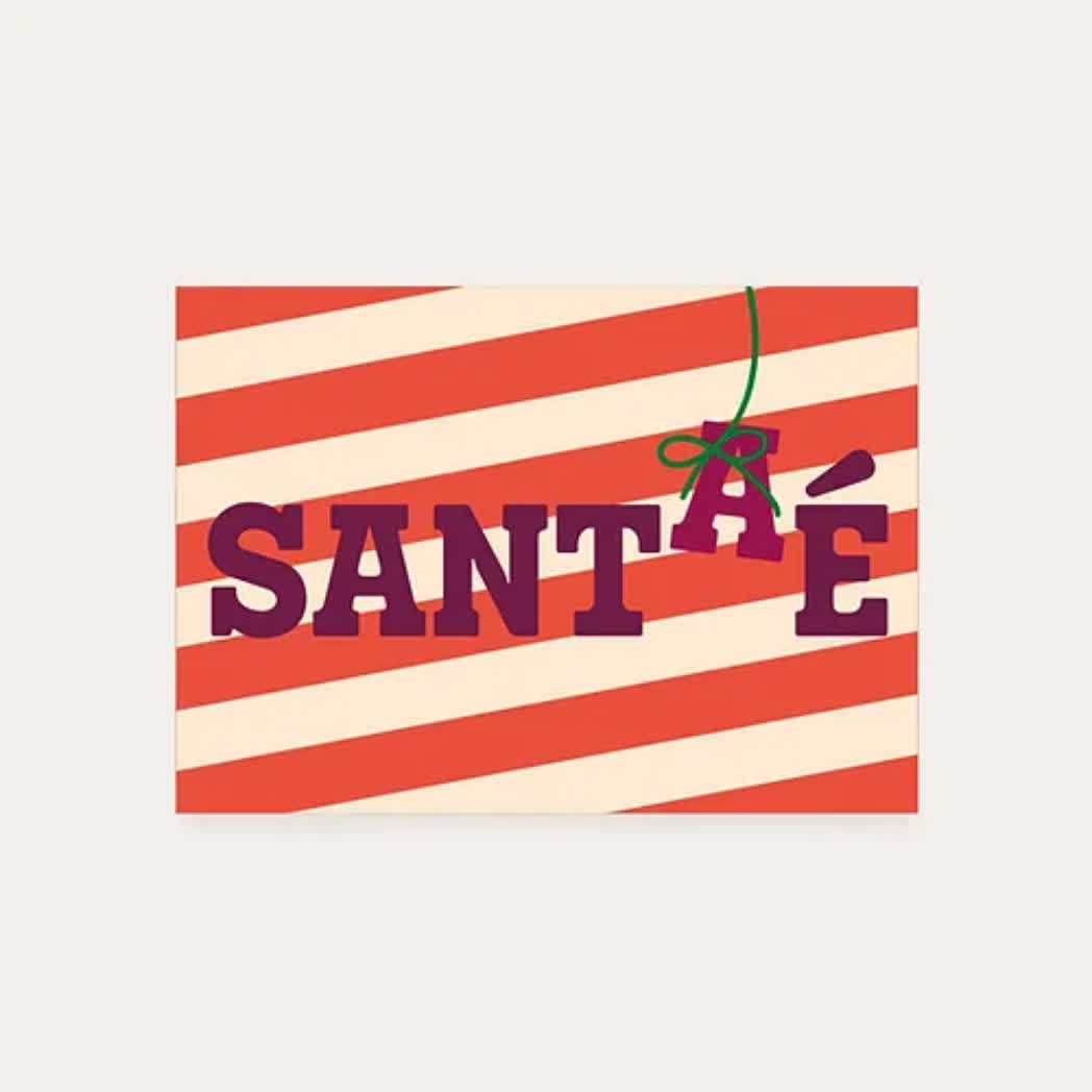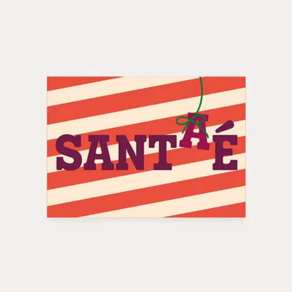 De Heyday Wenskaart Sant(a)é is uitgevoerd in Rood/Wit gestreept papier met de tekst in Donker Bruin. Deze kaart perfect om je kerst- en nieuwjaarsgroeten op een speelse en stijlvolle manier te versturen. Het opvallende ontwerp maakt de kaart een feestelijke toevoeging aan de feestdagen.