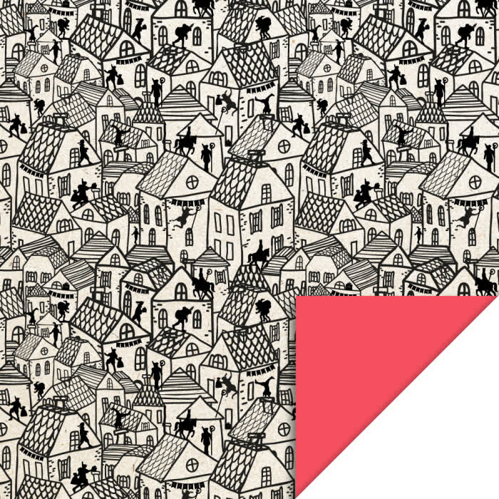 Het inpakpapier Sint Dorp van House of Products (HOP) is uitgevoerd in een kleurrijk ontwerp met gezellige Sinterklaasillustraties. Dit stevige papier is perfect om cadeaus feestelijk in te pakken en brengt direct de warme sfeer van pakjesavond in huis.