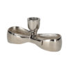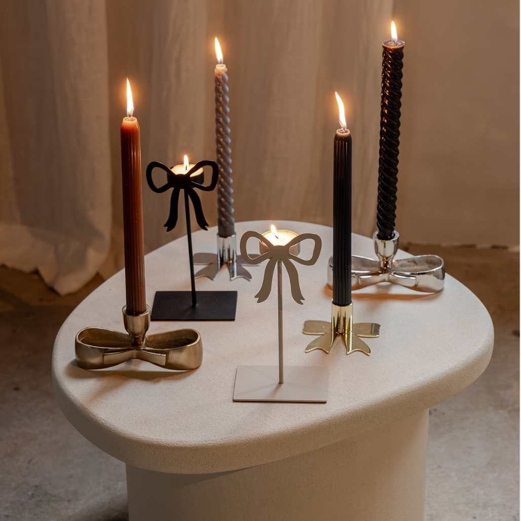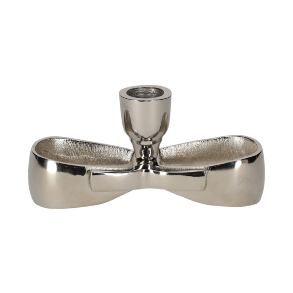 Deze stijlvolle zilverkleurige kandelaar van Jens Living is uitgevoerd in de vorm van een elegante strik. Gemaakt van stevig metaal en met een afmeting van 14,5 x 5,5 x 6,5 cm, is dit een decoratief item dat sfeer en klasse toevoegt aan ieder interieur. Perfect om een kaars mooi te presenteren tijdens speciale momenten of gewoon als chic woonaccessoire.
