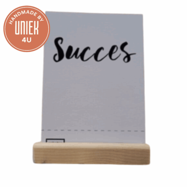 De handgemaakte kaart van Uniek met de tekst “Succes” is uitgevoerd in wit met zwarte letters en heeft een rechthoekige vorm. Gemaakt van papier, is deze stijlvolle kaart een persoonlijk en bijzonder product om iemand succes te wensen.