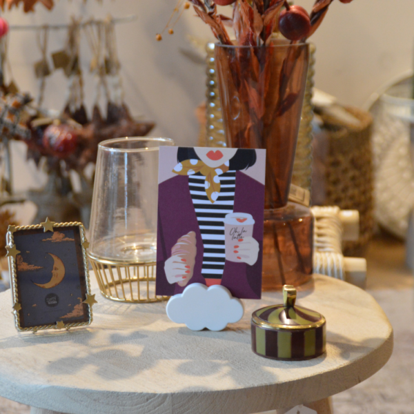 Deze handgemaakte kaarthouder in de vorm van een wolk is een subtiele en charmante manier om kaarten of foto’s neer te zetten. Gemaakt van wit porseleingips en met een afmeting van 6,5 x 4 x 2,5 cm past hij perfect op een plank, bureau of dressoir. Dankzij het minimalistische design past de houder in elk interieur. Ideaal voor kaartjes met een lieve boodschap of als decoratief detail.