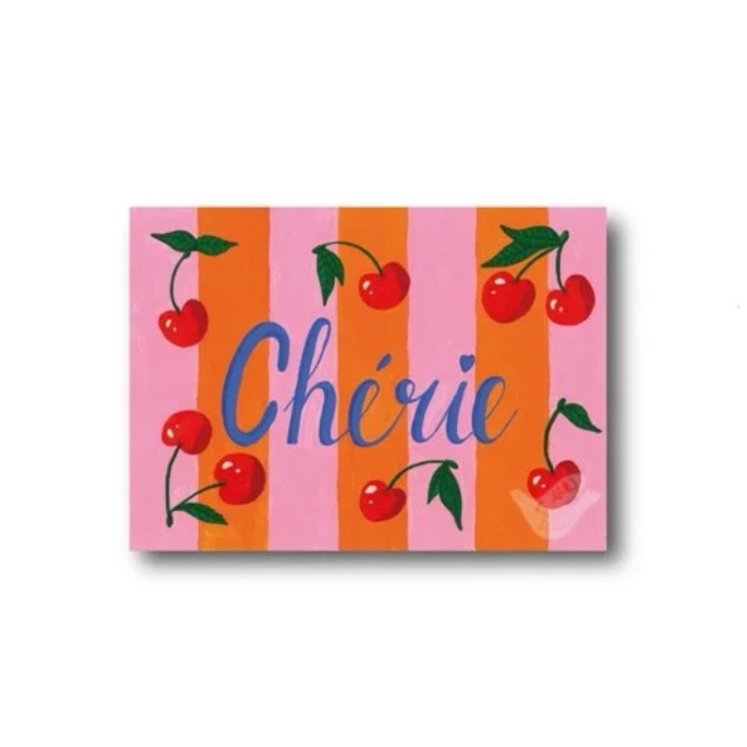 Stijlvolle A6 ansichtkaart van Kirsten Blom met de tekst “Chérie” in een vrolijk multicolor ontwerp. De kaart is perfect om te versturen, bij een cadeau te voegen of als klein decoratief accent te gebruiken. Een lieve en kleurrijke kaart voor elk moment.