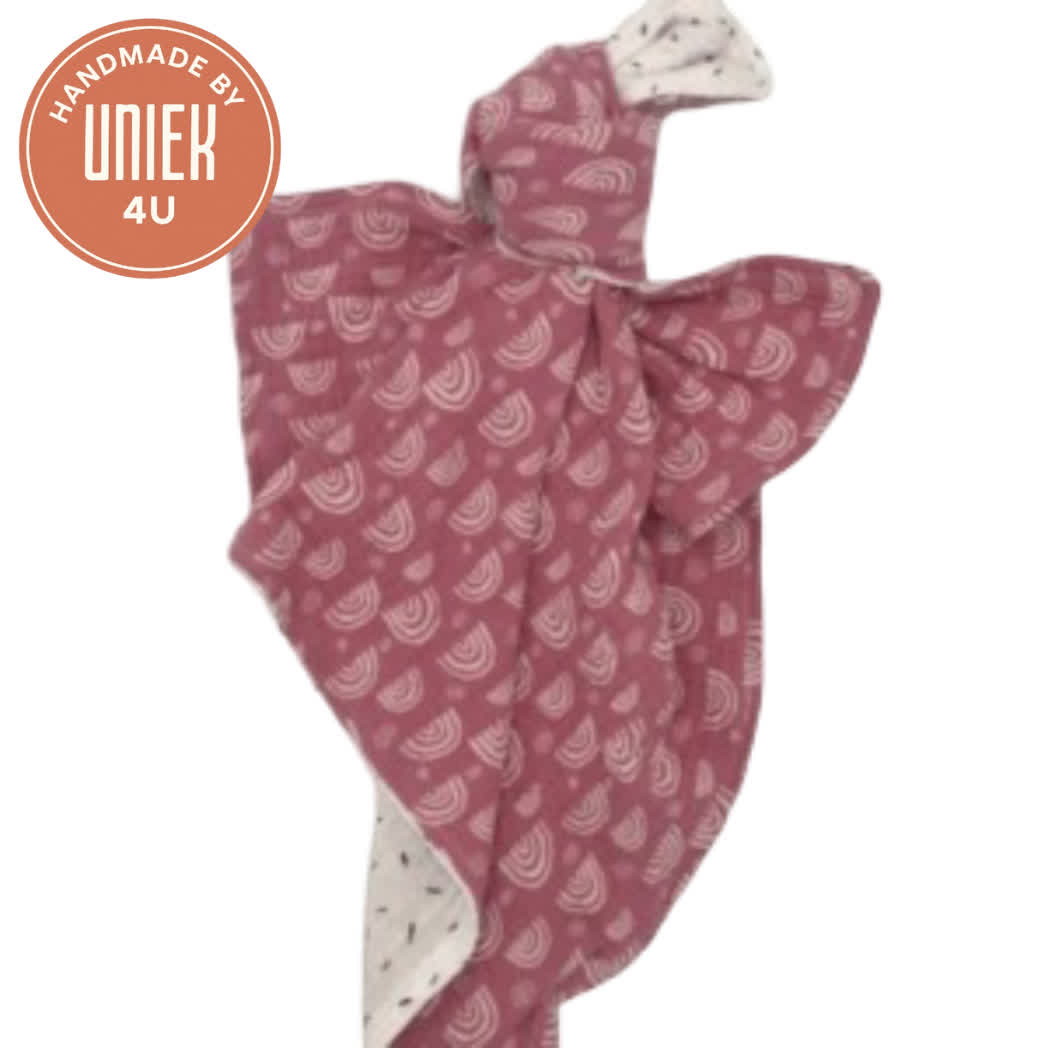 Dit zachte knuffeldoekje in roze met wit is versierd met vrolijke spikkels en regenbogen. Ideaal voor baby’s en peuters om mee te knuffelen of vast te houden. Een lief en praktisch cadeautje voor een geboorte of babyshower.