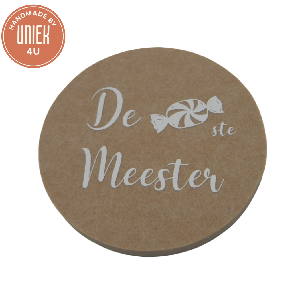De Meester bedankje onderzetter – De tof(fee)ste meester is een origineel en handgemaakt cadeau voor het einde van het schooljaar. Gemaakt van gerecyclede PET-flessen in een stoere bruine kleur, is deze onderzetter zowel duurzaam als stijlvol. Op het kaartje staat de leuke tekst “De tof(fee)ste meester”, perfect voor koffieliefhebbende meesters. Een praktisch én persoonlijk bedankje met een knipoog!