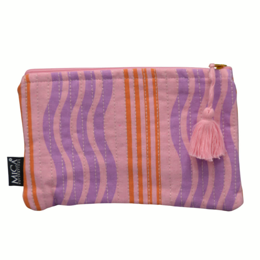 Dit Mica tasje is een rechthoekig tasje met roze strepen, gemaakt van katoen. Met een afmeting van 20,5 x 13,5 cm heeft dit tasje een compact en praktisch formaat voor het opbergen van kleine spullen. De roze strepen geven het tasje een speelse en decoratieve uitstraling. Het katoenen materiaal zorgt voor een zachte en natuurlijke look.