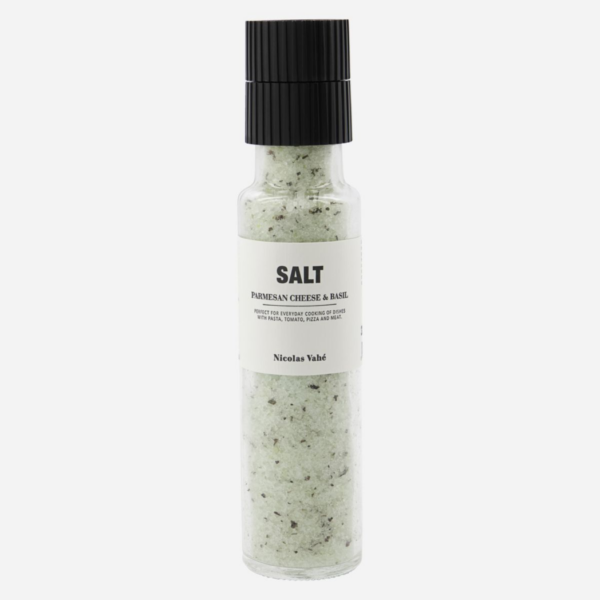 Zout met parmezaanse kaas en basilicum. Ingrediënten: zeezout 97% (antiklontermiddel E535), parmezaanse kaas 3% (melk, zout, stremsel), gedehydrateerde basilicum, peterseliepoeder, essentiële basilicumolie. Kan sporen bevatten van noten, pinda’s, sesam, mosterd en sulfieten.