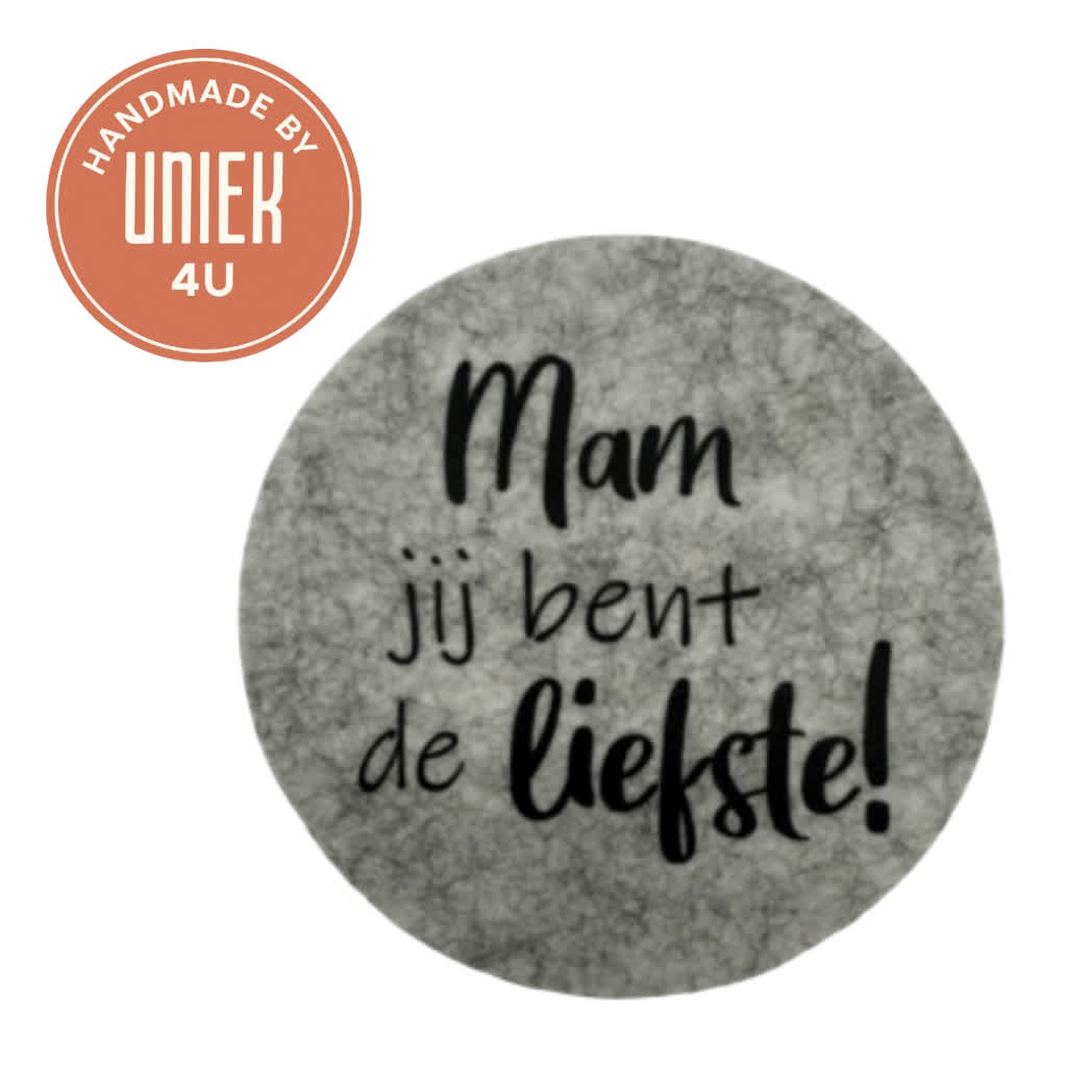 De onderzetter Mam, je bent de liefste is gemaakt van gerecyclede PET-flessen. Dit duurzame en stevige item beschermt oppervlakken en brengt tegelijkertijd een persoonlijke en liefdevolle boodschap in huis of op kantoor.