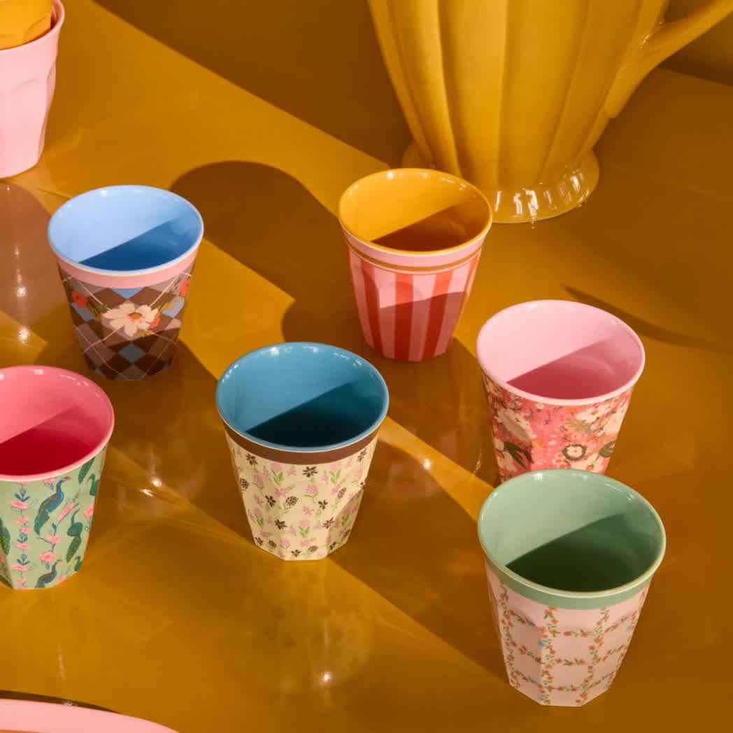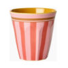 De RICE beker ‘Organic Stripes’ is een ronde beker van melamine met een hoogte en diameter van 9 cm. De buitenzijde is uitgevoerd in rode en roze strepen en de binnenkant heeft een donkergele kleur. Dit merkproduct beker is gemaakt van stevig melamine en is vaatwasserbestendig, waardoor hij praktisch is voor dagelijks gebruik. Een kleurrijke en functionele beker die perfect past in elke keuken.
