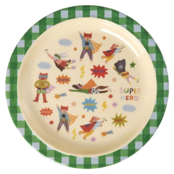 Het RICE kinderbord “Superhero” is een ronde melamineborden van 22 cm in diameter, uitgevoerd in de kleur groen. Deze merkproduct bord is duurzaam, licht van gewicht en vaatwasserbestendig, waardoor het ideaal is voor dagelijks gebruik door kinderen. Het vrolijke ontwerp maakt eten leuk en zorgt voor een kleurrijke toevoeging aan de kindertafel.