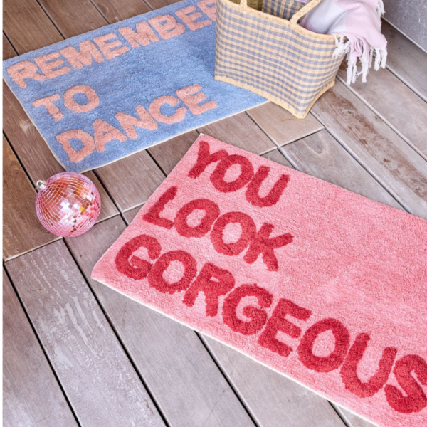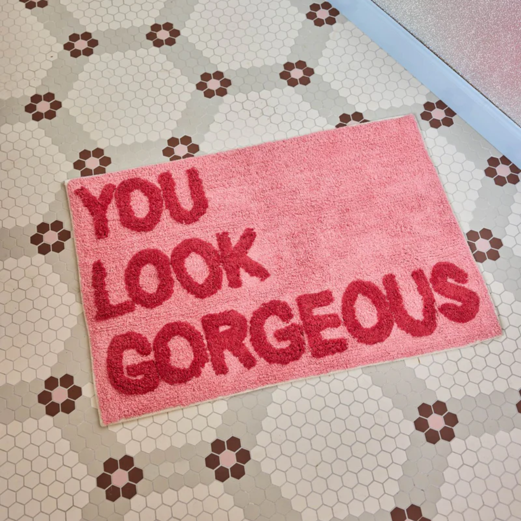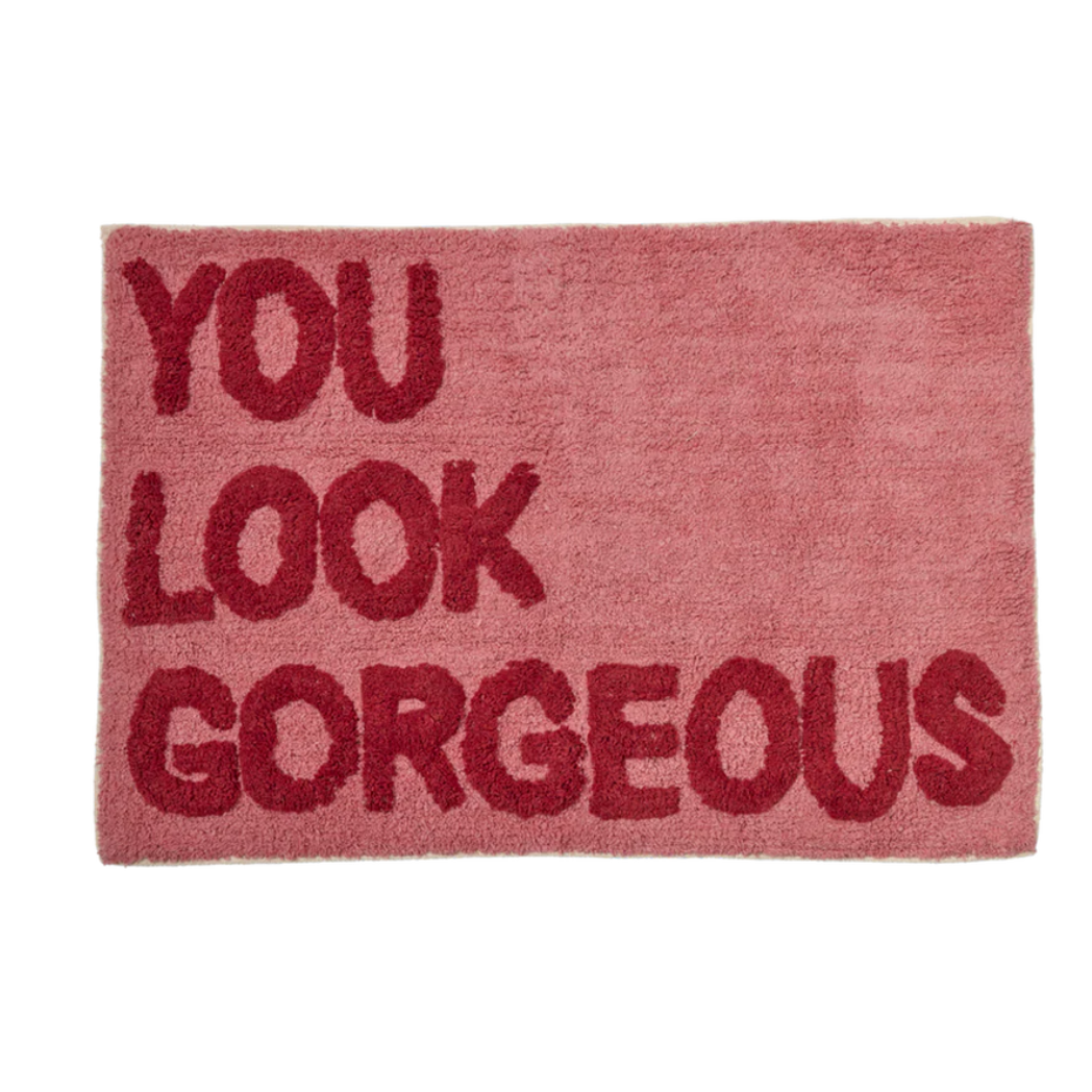 Vrolijke, rechthoekige vloermat met de tekst “You look gorgeous” in een zachte roze kleur. De mat is gemaakt van katoen en heeft een getufte structuur, wat zorgt voor een speels en comfortabel effect. Leuk voor bij de voordeur, in de hal, badkamer of slaapkamer als gezellige eyecatcher.