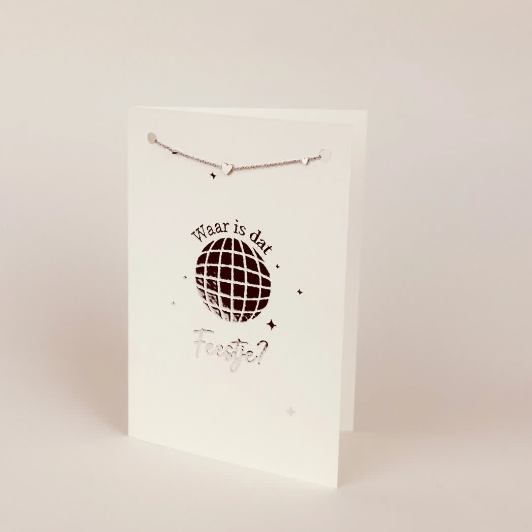 Sieradenkaart – Luxe wenskaart – Waar is dat feestje met armband – Zilver