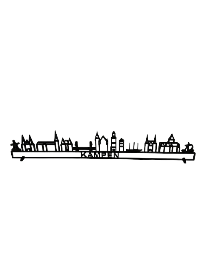 Deze zwarte MDF muurdecoratie van City Shapes toont de skyline van Kampen in een compact formaat van 33,5 x 7,5 cm. Ideaal als subtiel en stijlvol accent voor aan de muur, op een plank of in