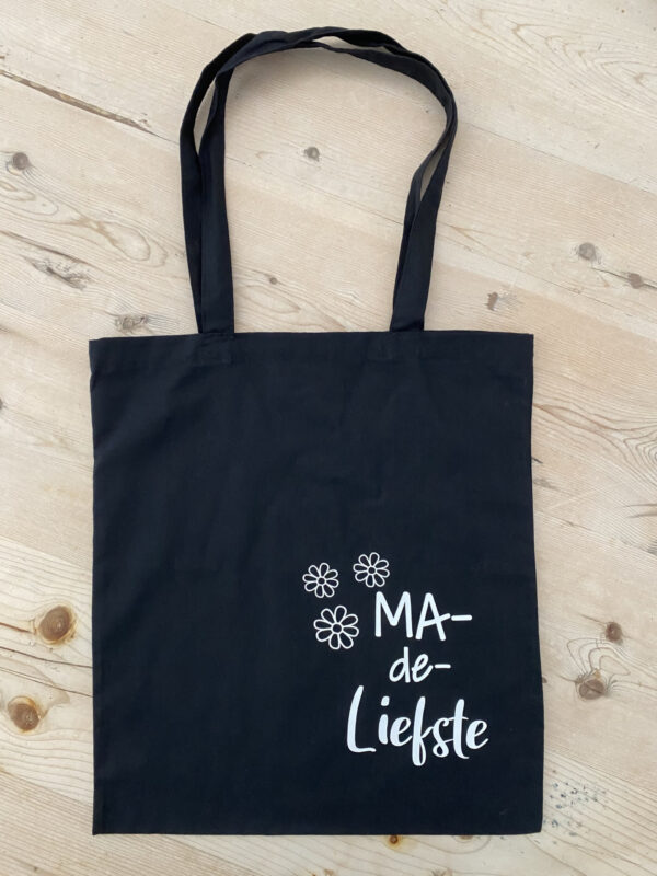 Verras je moeder met deze zwarte linnentas met de tekst “Ma de liefste” en een schattig madeliefjespatroon. Gemaakt van stevig lint, ideaal voor het dragen van kleine spullen of het verpakken van cadeautjes. Duurzaam, herbruikbaar en stijlvol.