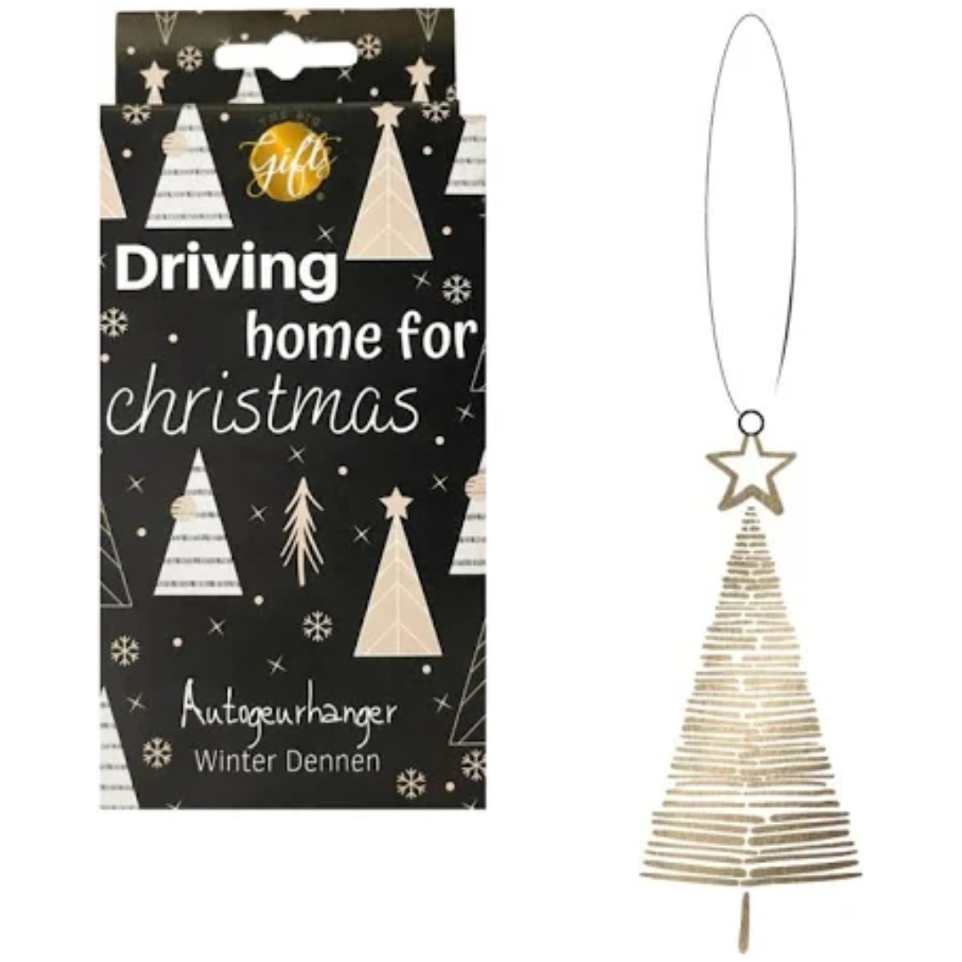 De The Big Gifts autogeurhanger Winter Dennen brengt direct een winterse sfeer in je auto. Met een frisse dennengeur past hij perfect bij de feestdagen. De hanger (17 x 8 cm) komt in een stijlvol zwart doosje met witte opdruk en de tekst “Driving home for Christmas” – ideaal als klein kerstcadeau.